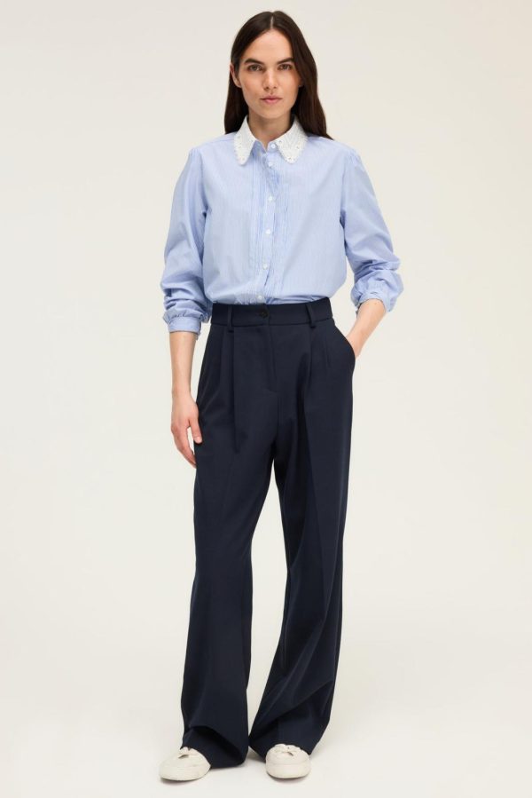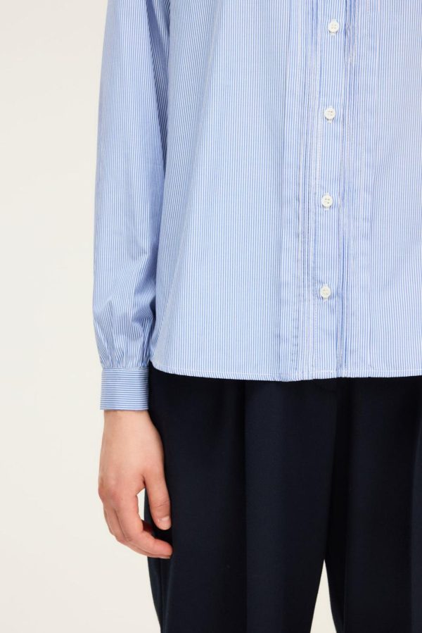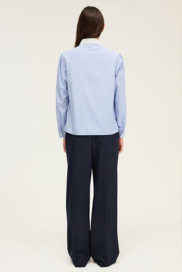 Chemise à rayures bleues et blanches qui se distingue par ses détails de plis plats et d’incrustations de dentelle dans un esprit vintage.En popeline de coton.