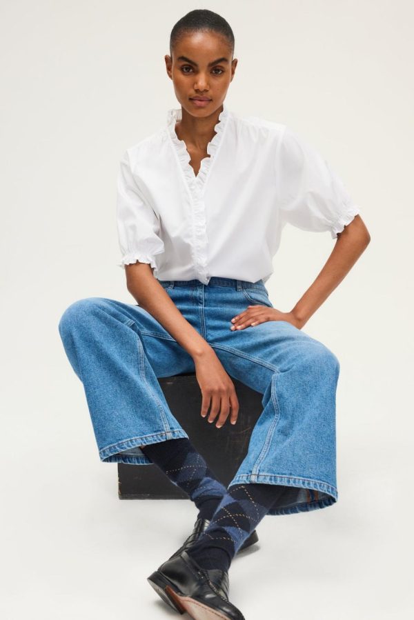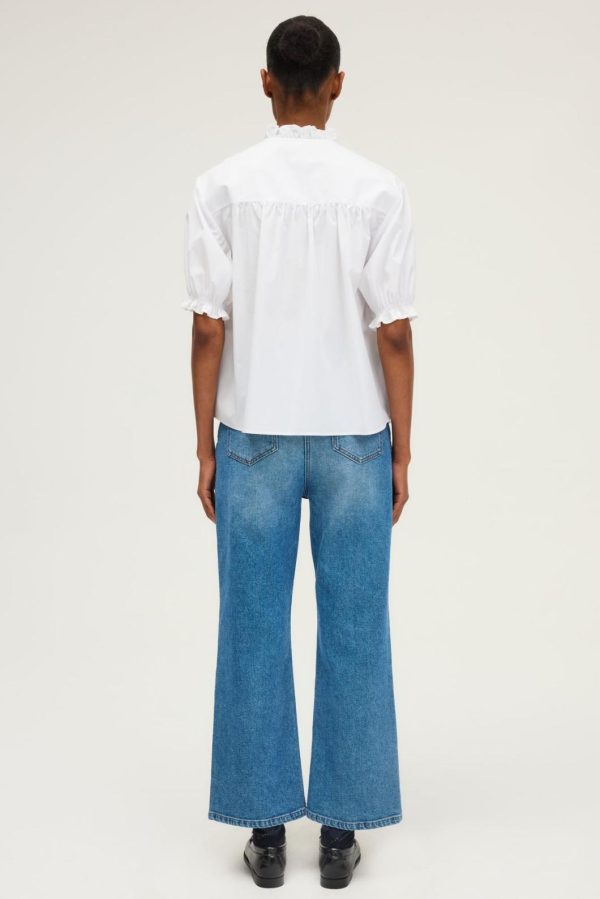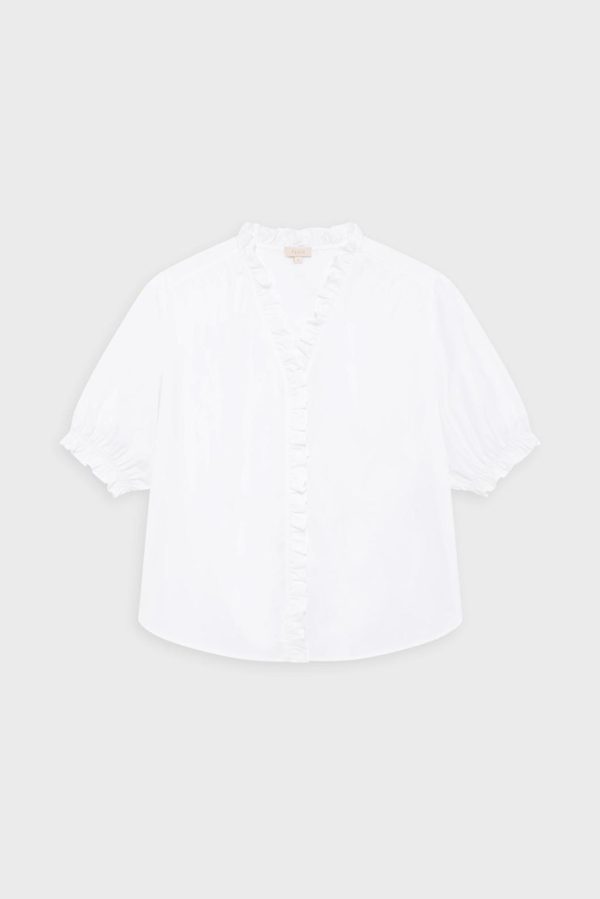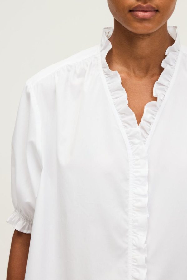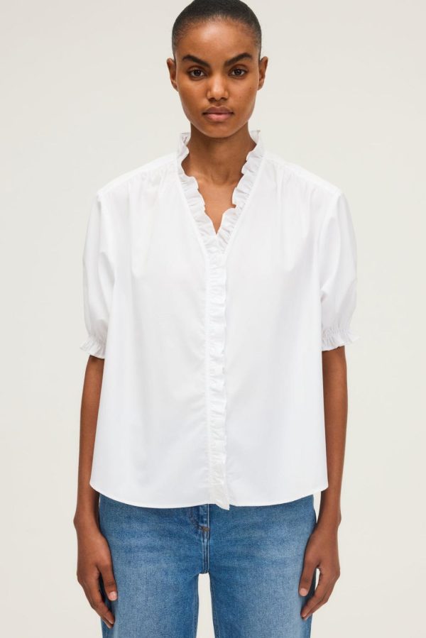 Esprit romantique pour cette chemise à manches courtes et ornée de volants. 100% popeline de coton blanc.