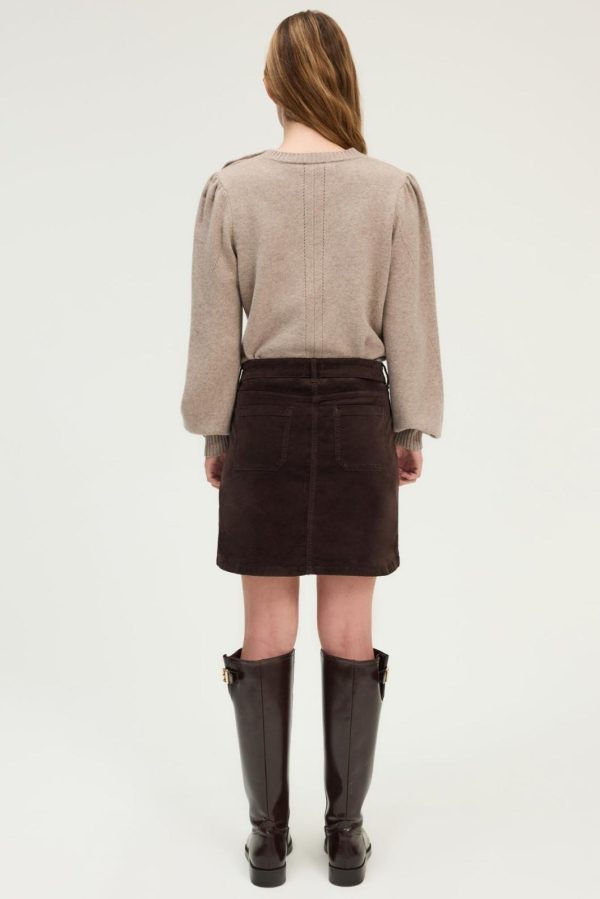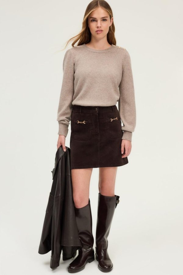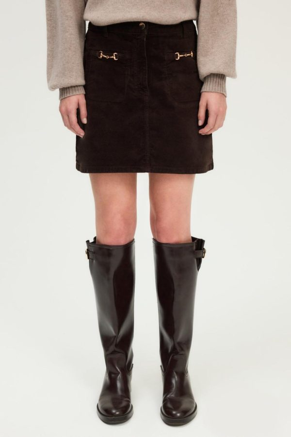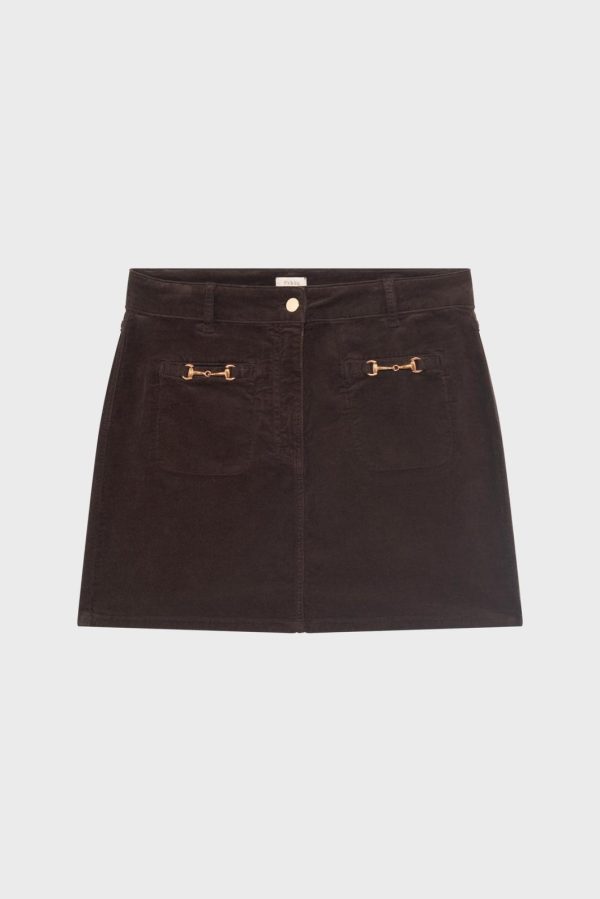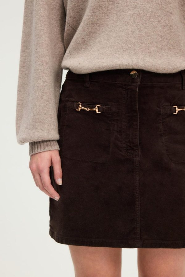 Mini-jupe en velours lisse marron, et aux poches ornées de mors dorés pour un esprit preppy chic.