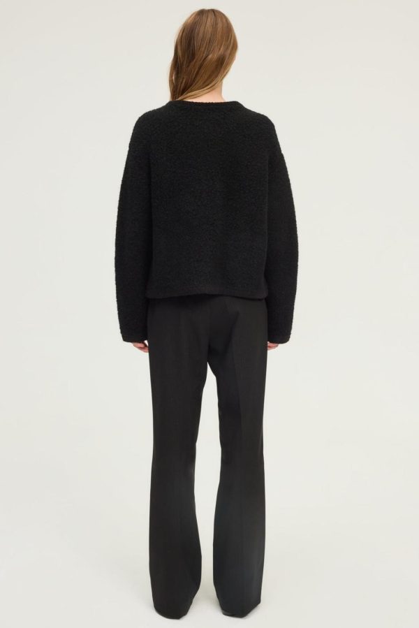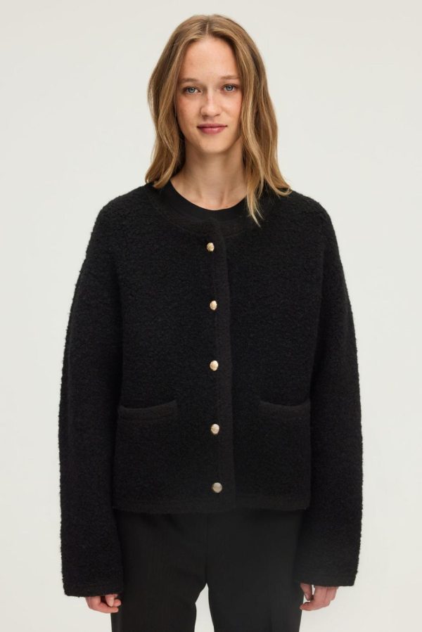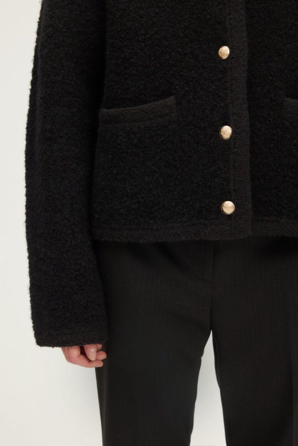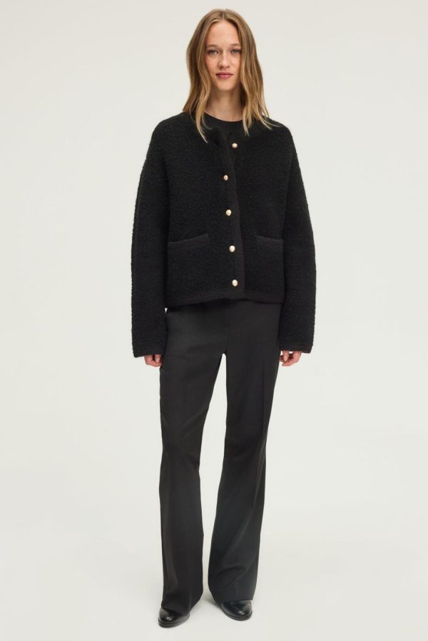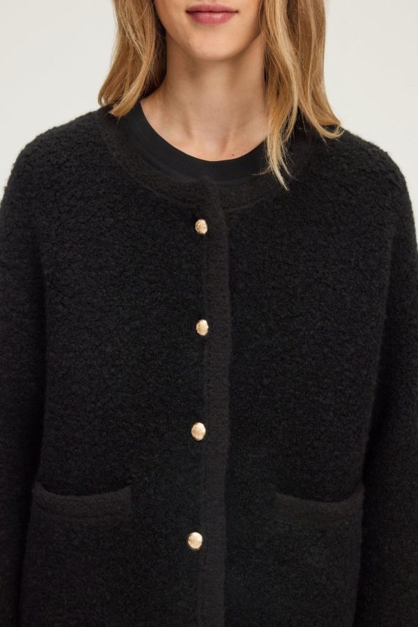 Gilet noir épais à col rond et boutons dorés dans un esprit veste. A porter avec une chemise ou sur un tee-shirt pour un look casual chic. Confectionné dans un mélange contenant de la laine et de l’alpaga.