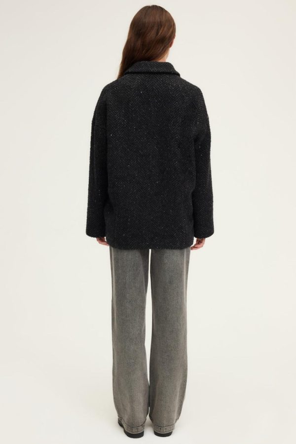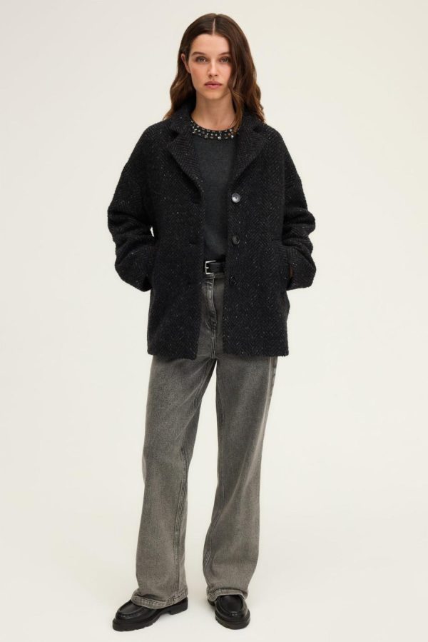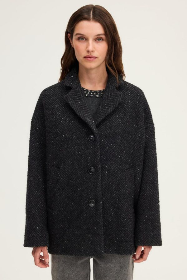 Esprit contemporain pour ce manteau aux épaules tombantes et aux chevrons noirs rehaussés d’une pointe de lurex. En laine mélangée.