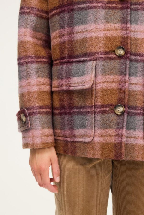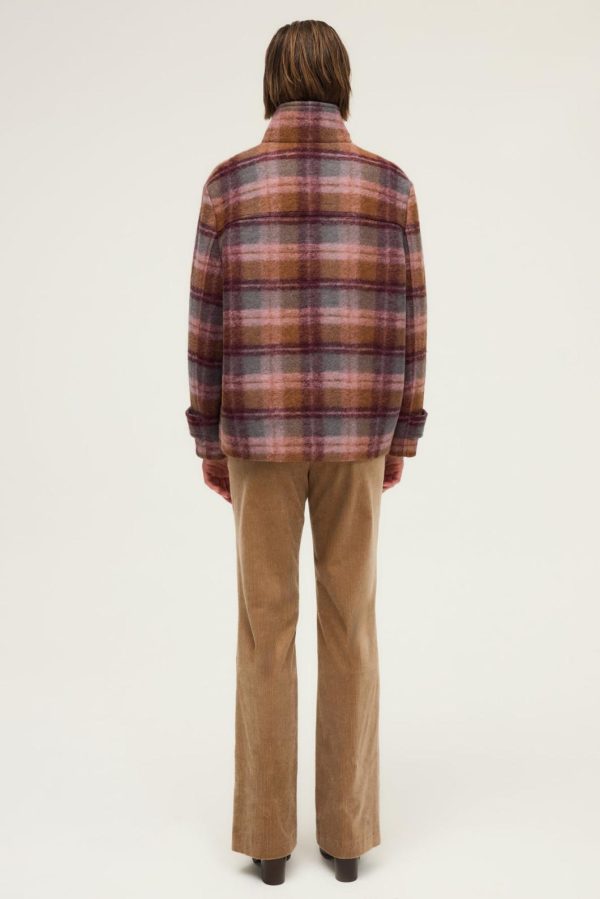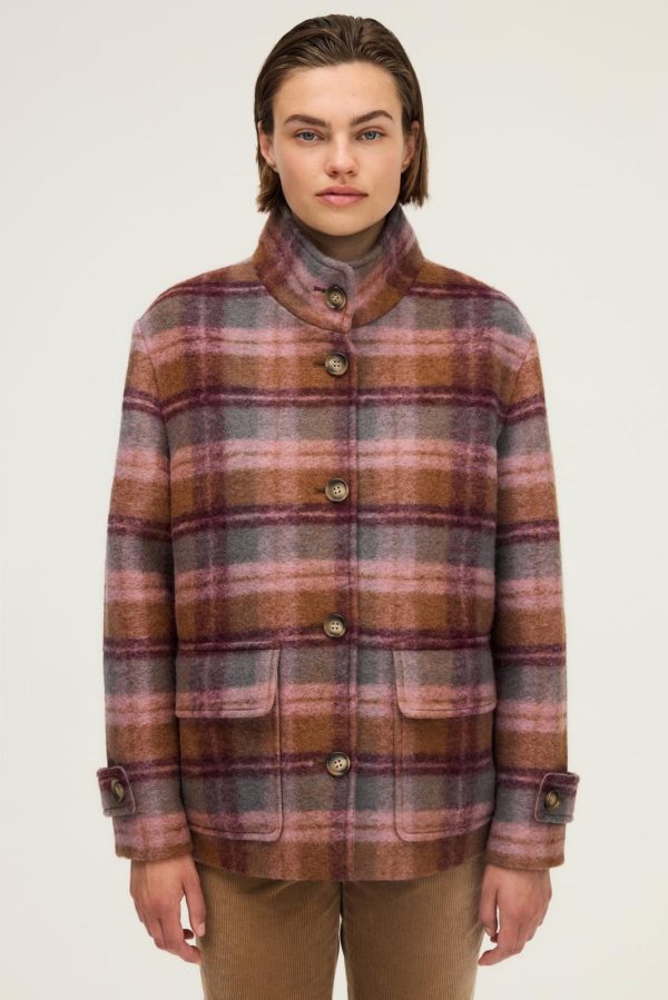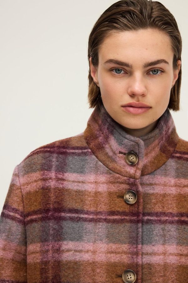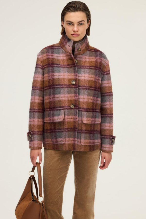 Manteau ample à col montant orné de carreaux dans des tons de rose, kaki et camel pour dynamiser une tenue foncée. Confectionné en laine mélangée.