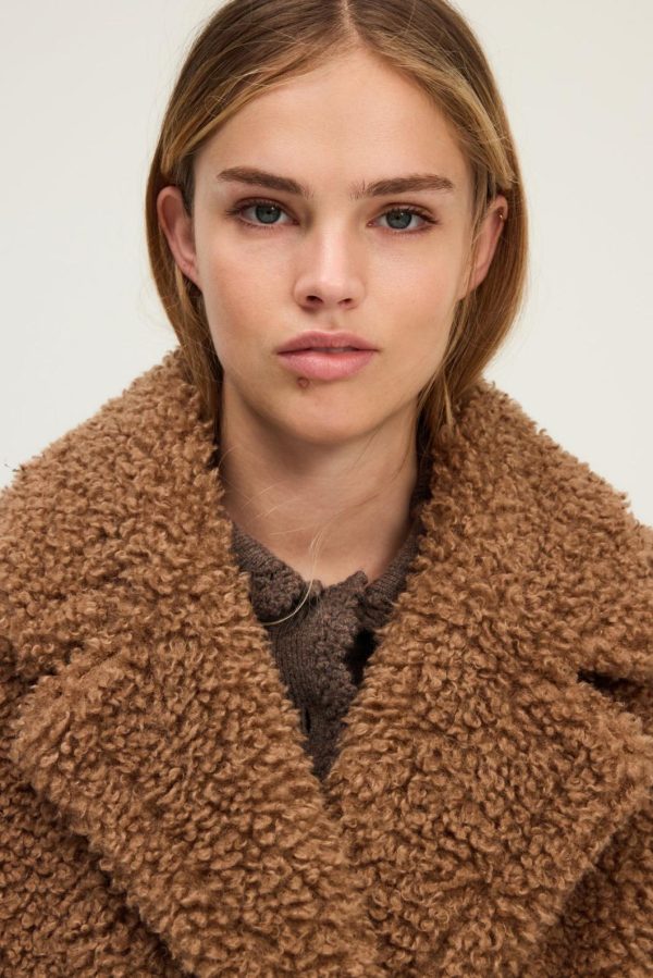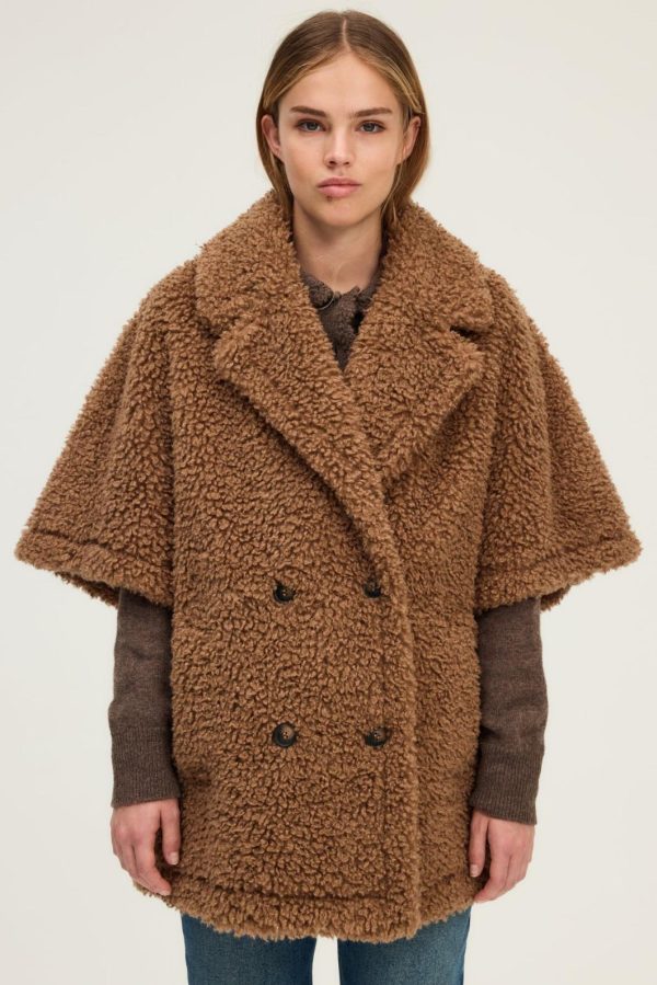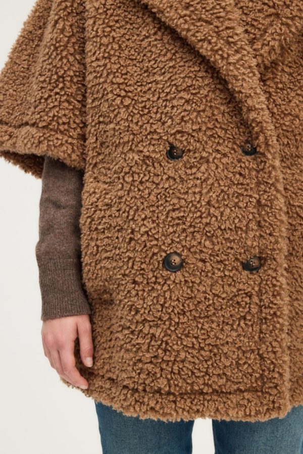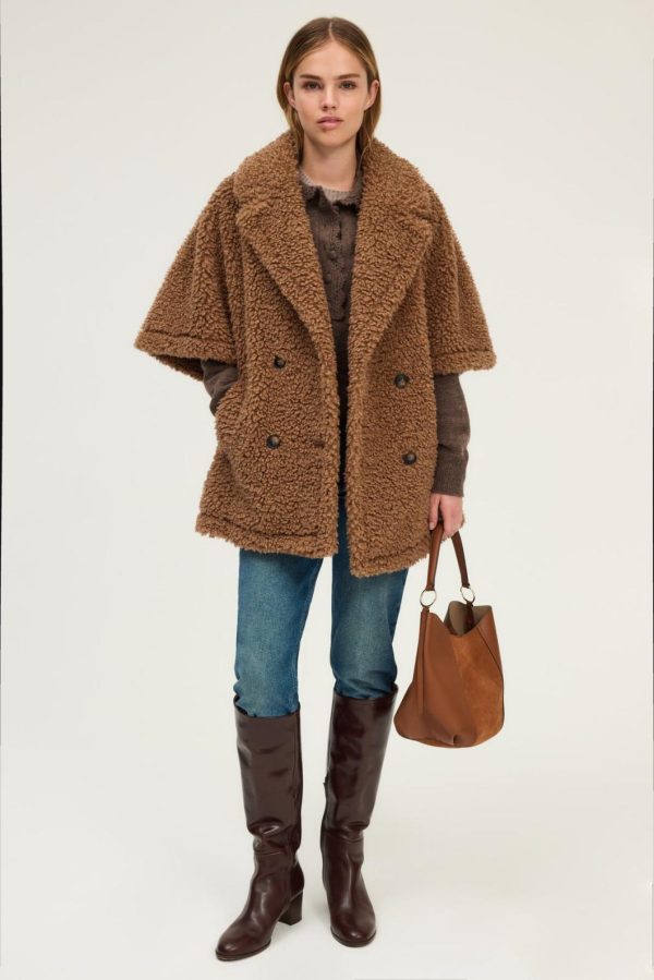 Avec son volume ample rappelant une cape, ce manteau en fausse fourrure camel donnera un côté vintage chic à la tenue. Matière au toucher très doux.