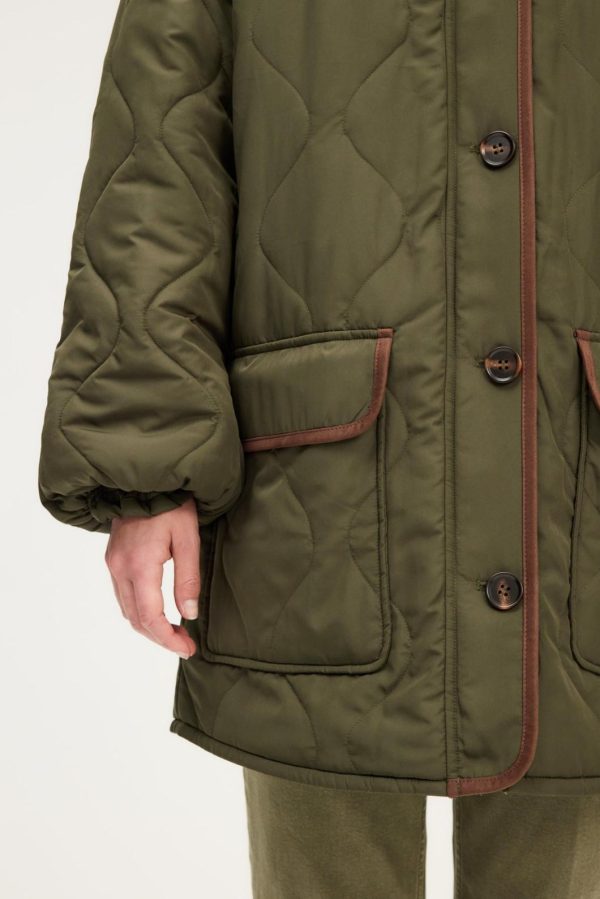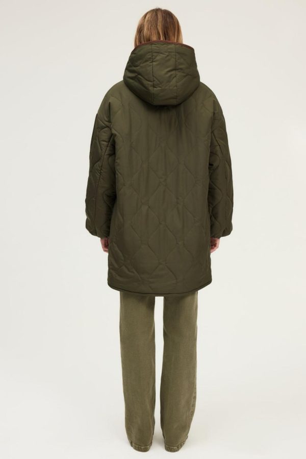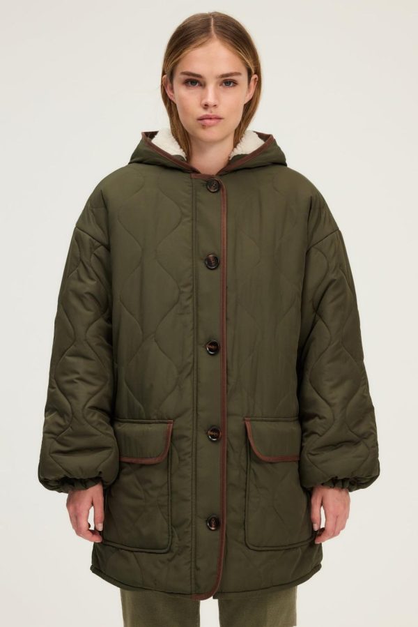 Parka matelassée fourrée avec une capuche pour les jours de froid. Confectionné dans un coloris kaki intemporel, il est rehaussé d’une ganse marron. Doublure en fourrure synthétique.