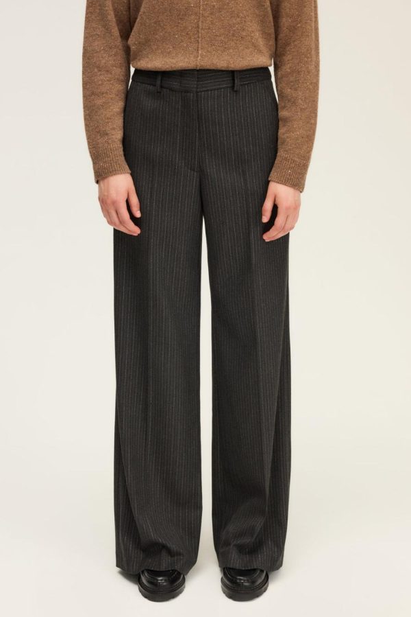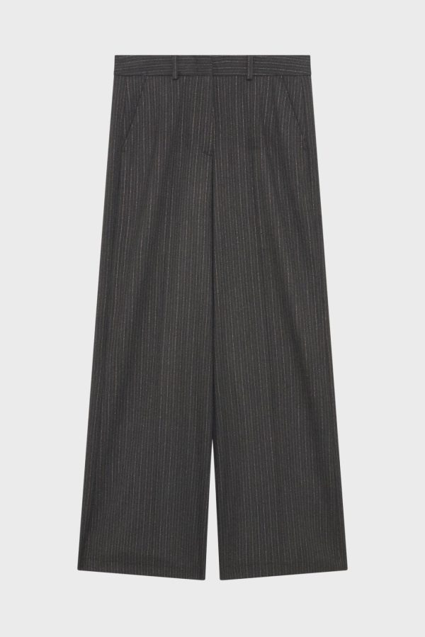 Pantalon large de tailleur anthracite, orné de fines rayures avec du lurex pour apporter une touche de fantaisie.