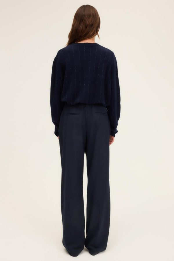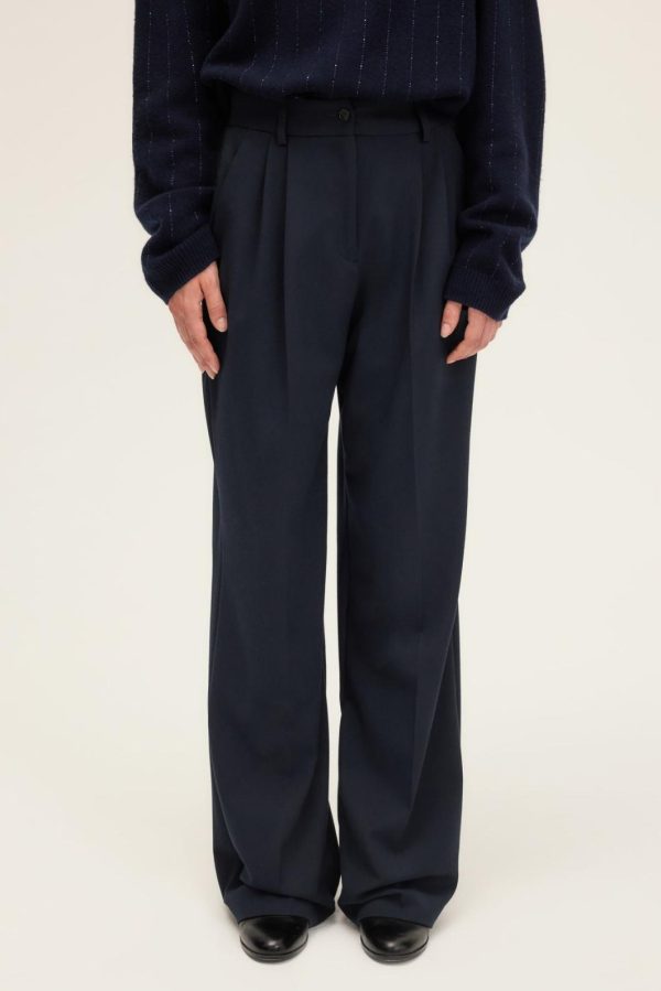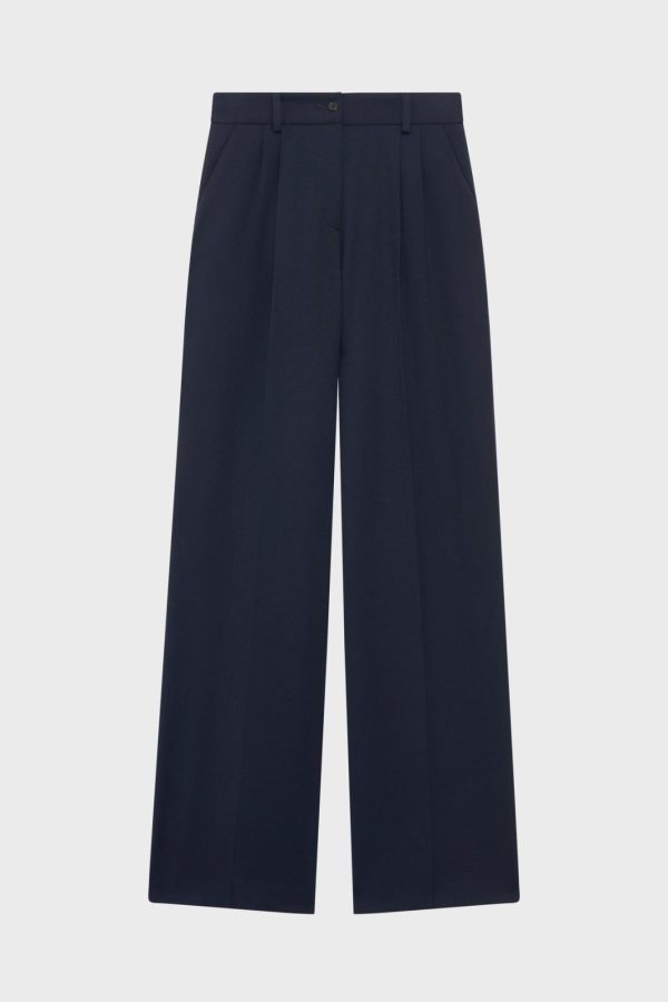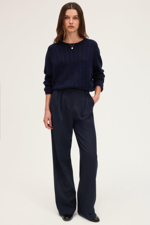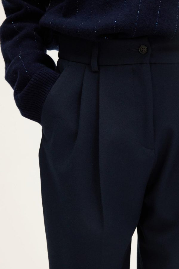 Pantalon large à pinces avec le dos élastiqué pour marier style et confort. Décliné en bleu marine, coloris intemporel. A porter avec la veste assortie dans un esprit tailleur, ou avec un pull pour un effet chic et décontracté.