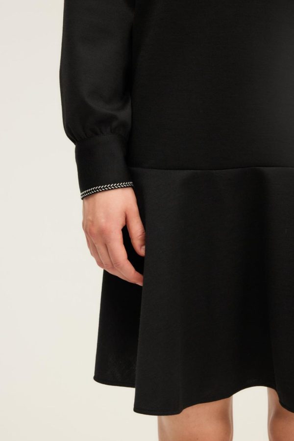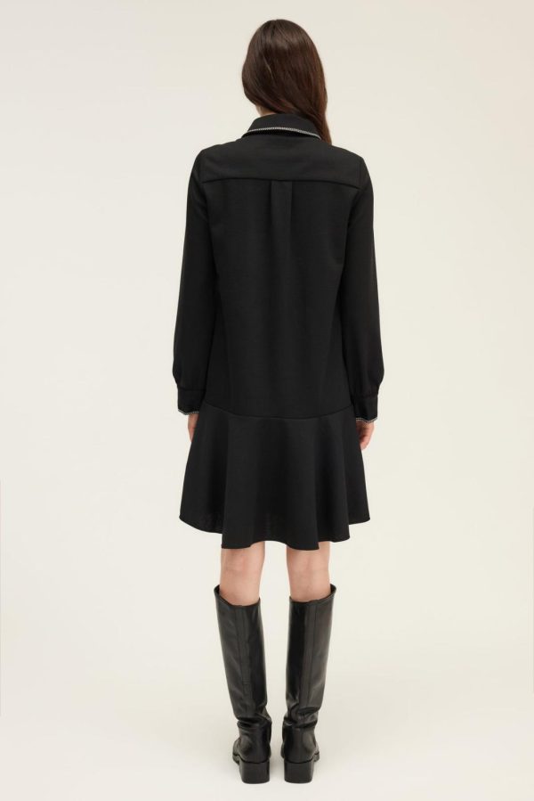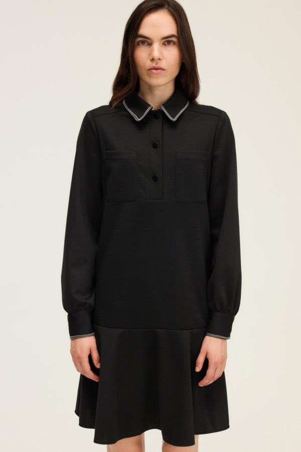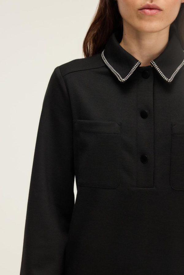 Robe noire à col polo avec un bas volanté pour lui donner du mouvement. Ses boutons noirs mats aux poches et à l’encolure lui apportent modernité et singularité.