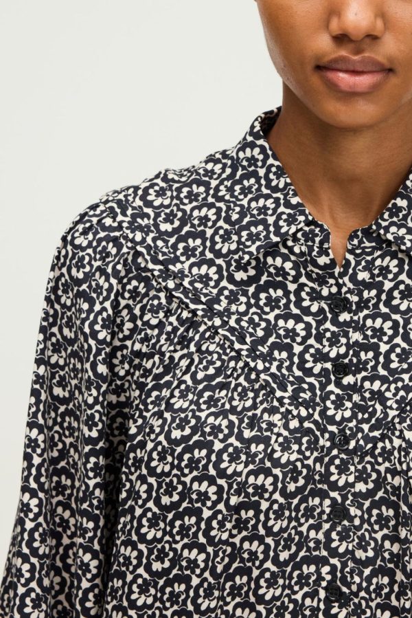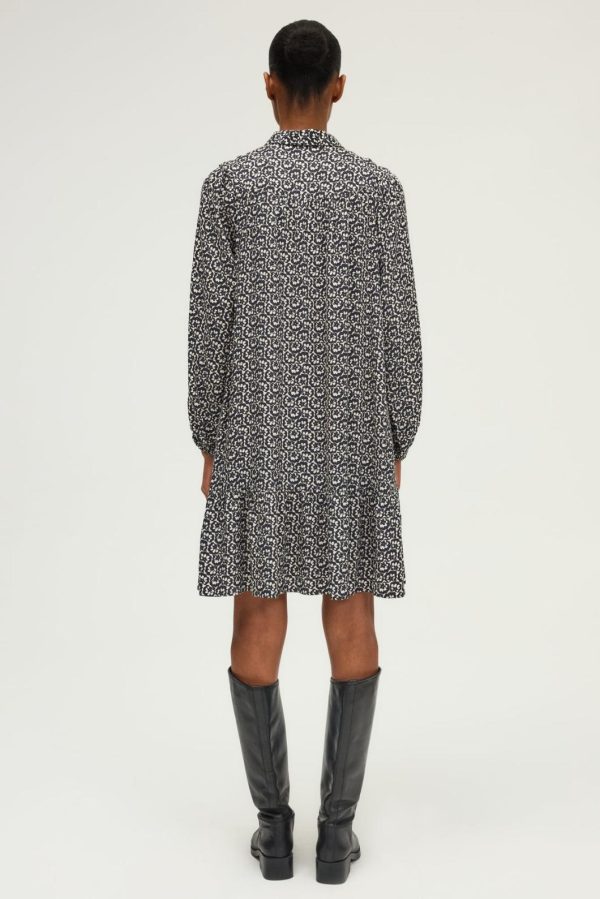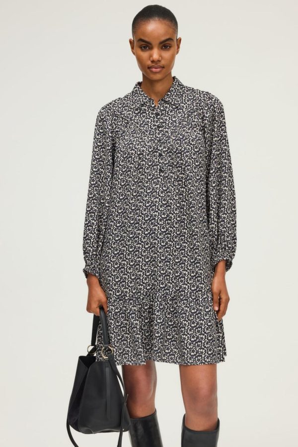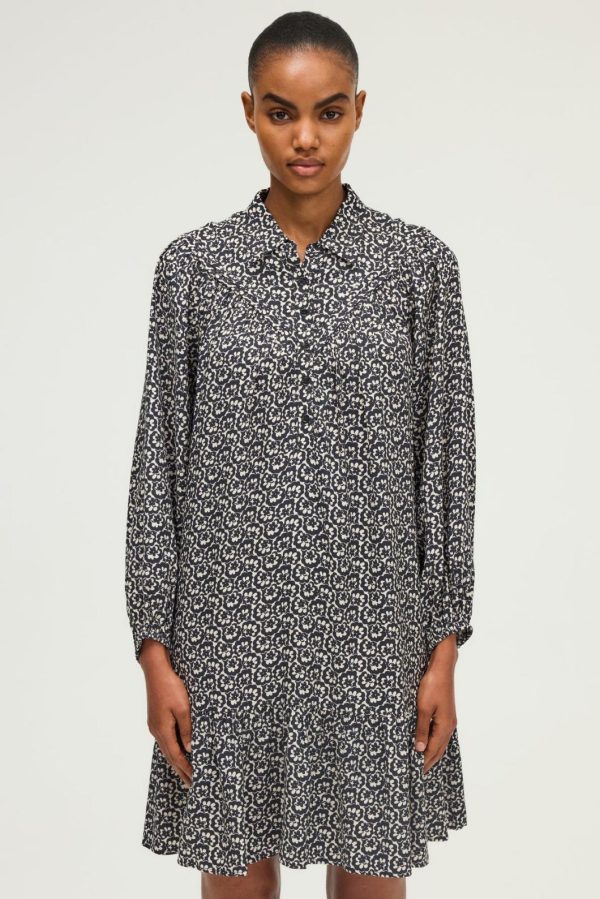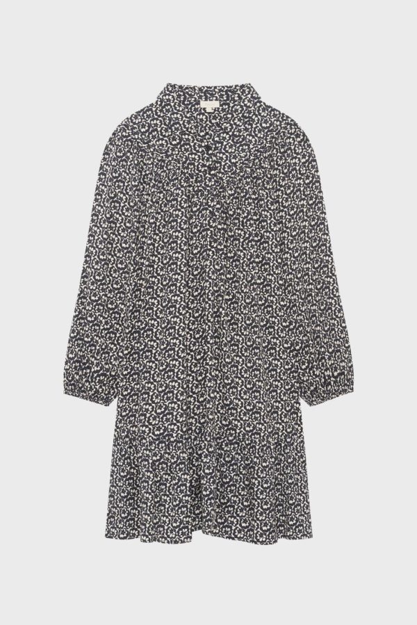 Robe d’inspiration seventies avec son col chemise et son motif de fleurs stylisé noir et blanc. Sa coupe est légèrement évasée avec un tombé volanté pour un côté féminin.