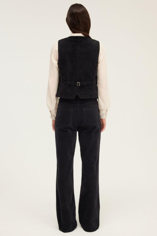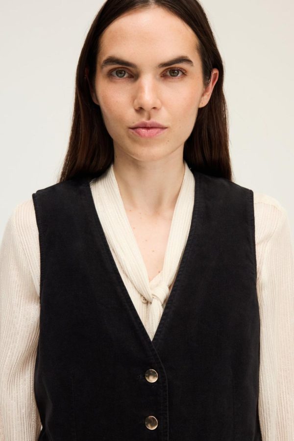 Confectionné en velours ras noir et orné de mors dorés, le gilet de tailleur Nola s’inspire de l’esprit seventies. Il se portera avec le pantalon flare assorti pour un look délicieusement vintage.