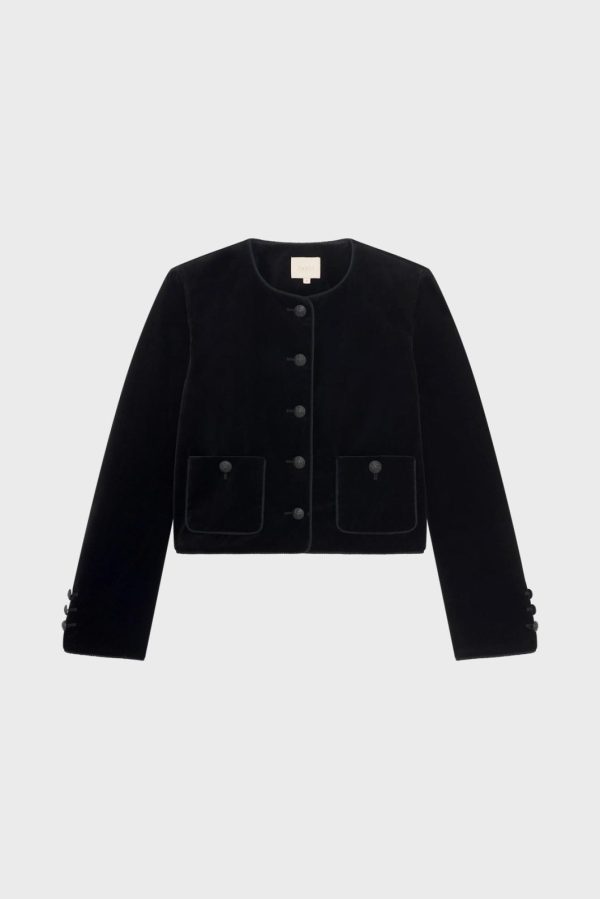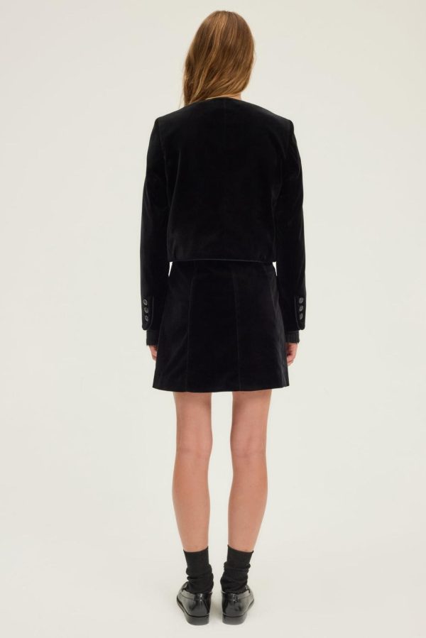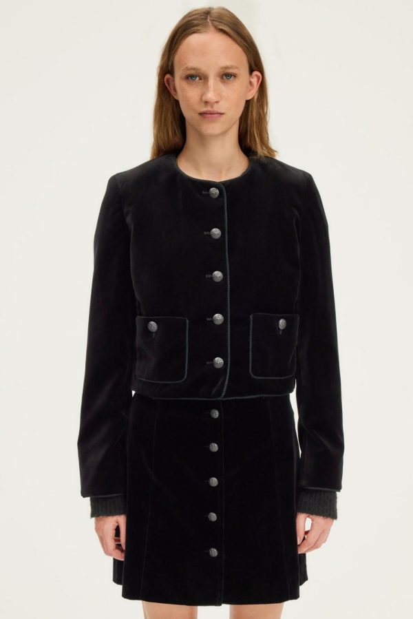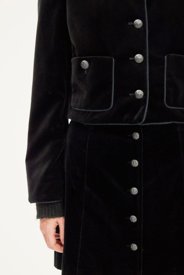 La veste Noa en velours noir se distingue par ses détails gansés et ses boutons ornés d’un blason gravé. Elle se portera très chic avec la jupe assortie, ou avec un jean pour jouer le décalé. Velours lisse aux reflets moirés.