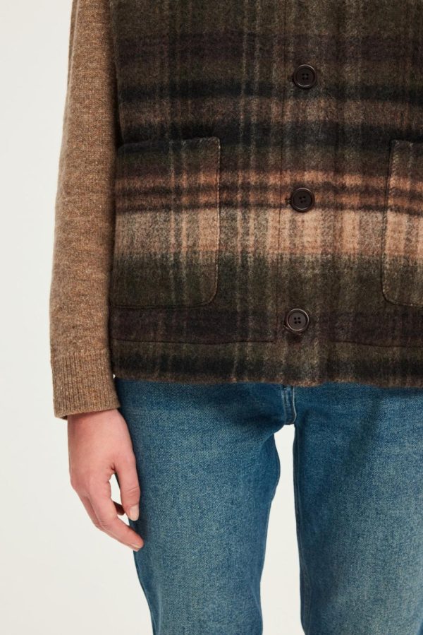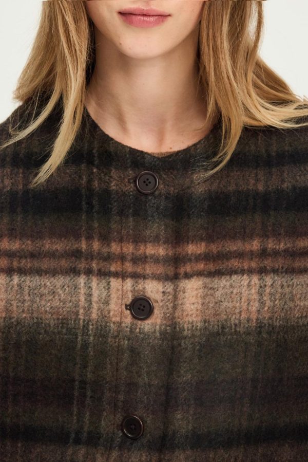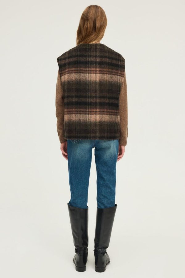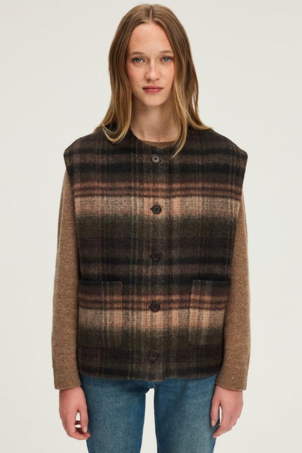 Veste sans manche à carreaux dans un esprit anglais. A porter avec un pantalon de tailleur, une jupe ou un jean. Confectionnée en laine mélangée dans des tons de marron et kaki.